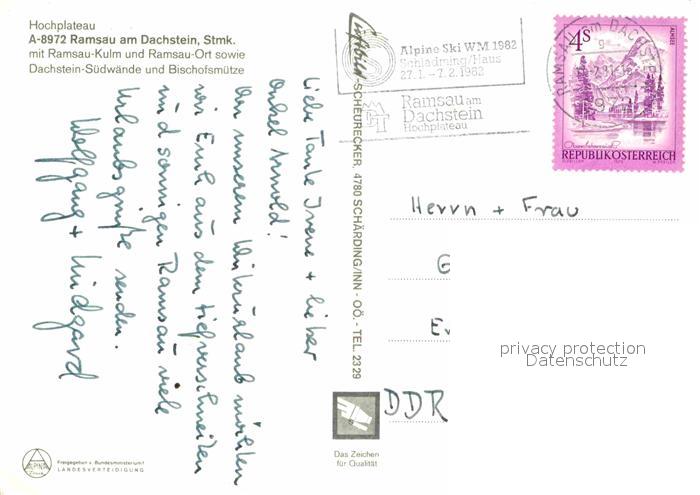 72699911 alte Postkarte Ramsau Dachstein Steiermark Panorama Skigebiet mit Bischofsmuetze Hochplateau Dachsteingebirge Fliegeraufnahme postalisch gelaufen Erhaltung siehe scans [FriedD77] KatCode: 11390222061236