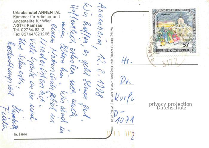 74042720 alte Postkarte Ramsau Hainfeld Niederoesterreich AT Urlaubshotel Annental postalisch gelaufen Erhaltung siehe scans [FriedD77] KatCode: 11390122031409
