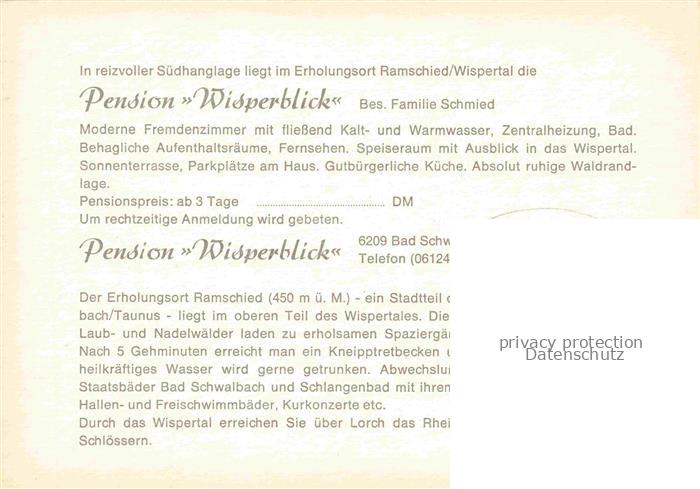 74037822 Ramschied Bad Schwalbach Hessen Pension Wisperblick postalisch nicht gelaufen Werbekarte (keine Postkarte) Erhaltung siehe scans [WerneD78] KatCode: 11110006439002