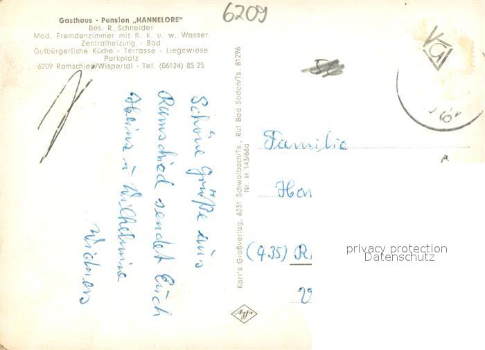 73708973 alte Postkarte Ramschied Gasthaus-Pension Hannelore wispertal WeisensteinSauerbrunnen Hirschwiese Lauksburg Burg Rheinberg Laukenmuehle Wisperquelle postalisch gelaufen Erhaltung siehe scans [LiesaD40] KatCode: 11110006439002