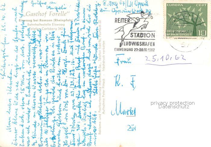 73670050 alte Postkarte Ramsen Pfalz Gasthof Forelle am Stausee Eiswoog postalisch gelaufen Erhaltung siehe scans [FriedD77] KatCode: 11110007333060