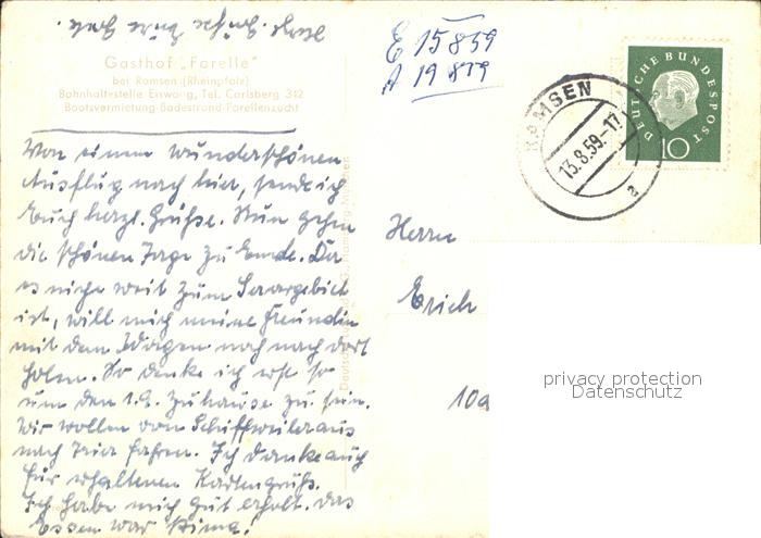 71938859 alte Postkarte Ramsen Pfalz Gasthof Forelle Bootsvermietung Badestrand Forellenzucht See Bruecke Fliegeraufnahme postalisch gelaufen Erhaltung siehe scans KatCode: 11110007333060