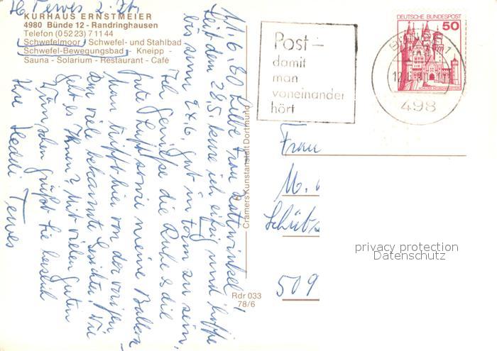 73662258 alte Postkarte Randringhausen Bad Kurhaus Ernstmeier Schwefelmoor Restaurant Eingang postalisch gelaufen Erhaltung siehe scans [FriedD77] KatCode: 11110005758004