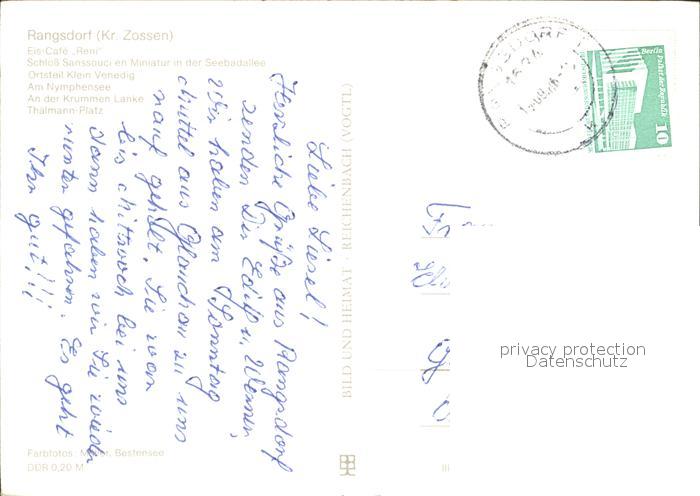 72331333 alte Postkarte Rangsdorf Eis-Cafe Reni Schloss Sanssouci Nymphensee postalisch gelaufen Erhaltung siehe scans KatCode: 11110012072340