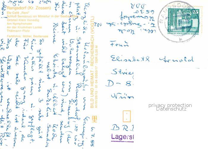 72820959 alte Postkarte Rangsdorf Eiscafe Schloss Sanssouci en Miniatur Seebadallee Klein Venedig Nymphensee Krumme Lanke Thaelmann Platz postalisch gelaufen Erhaltung siehe scans [FriedD77] KatCode: 11110012072340