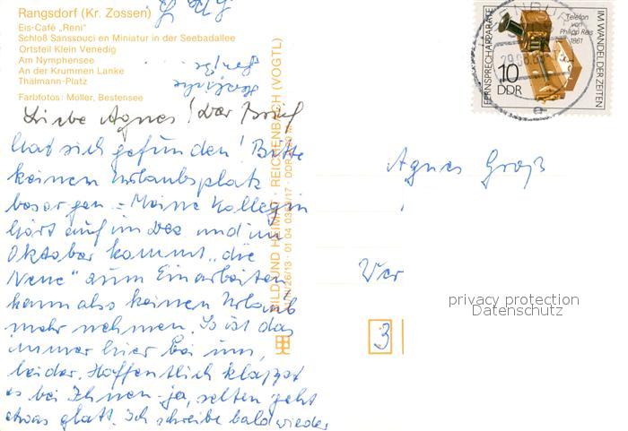 73574321 alte Postkarte Rangsdorf Eiscafe Schloss Sanssoucie in Miniatur OT Klein Venedig Nymphensee Krumme Lanke Ernst Thaelmann Platz postalisch gelaufen Erhaltung siehe scans [FriedD77] KatCode: 11110012072340