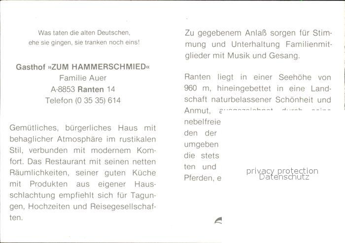 72179950 Ranten Gasthof Zum Hammerschmied postalisch nicht gelaufen Werbekarte (keine Postkarte) Erhaltung siehe scans KatCode: 11390226061418