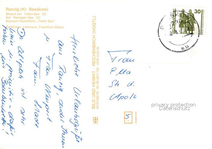 73061785 alte Postkarte Ranzig Strand am Tiefensee Ranziger See Konsum Gaststaette Tiefer See postalisch gelaufen Erhaltung siehe scans [FriedD77] KatCode: 11110012067493