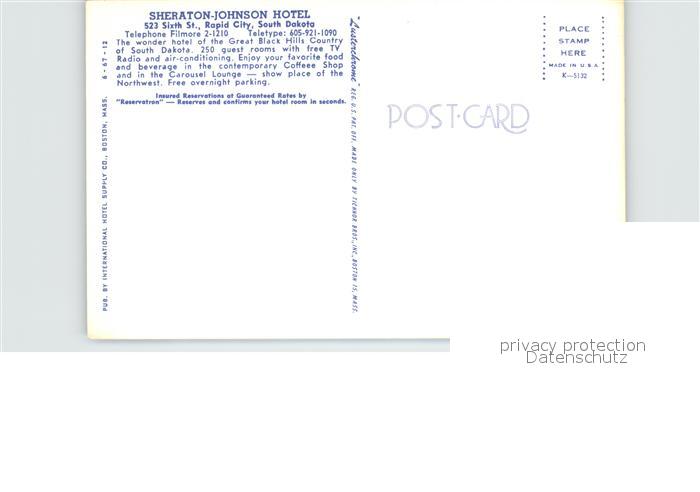 72484542 Rapid City South Dakota Sheraton Johnson Hotel postalisch nicht gelaufen Erhaltung siehe scans KatCode: 14140440000000