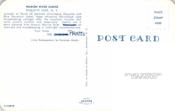 72743801 Raquette Lake Marion River Cabins postalisch nicht gelaufen Erhaltung siehe scans [LiesaD40] KatCode: 14140340000000