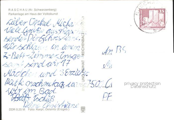 72047774 alte Postkarte Raschau Parkanlage Haus der Volkskunst postalisch gelaufen Erhaltung siehe scans KatCode: 11110014191250