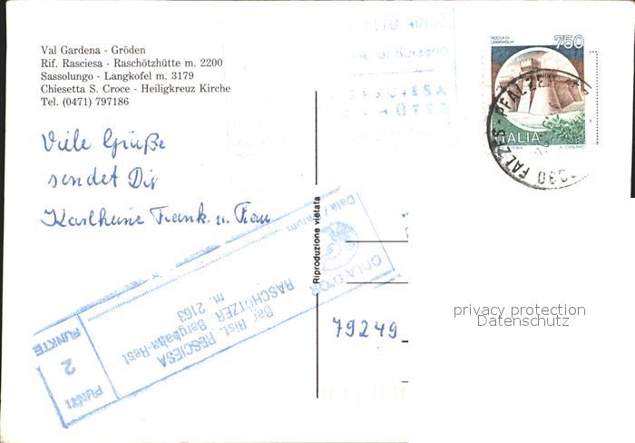 old postcard Raschoetzhuette Rifugio Resciesa Sassolungo Chiesetta Santa Croce Heiligkreuz Kirche Langkofel Dolomiten postalisch gelaufen Erhaltung siehe scans