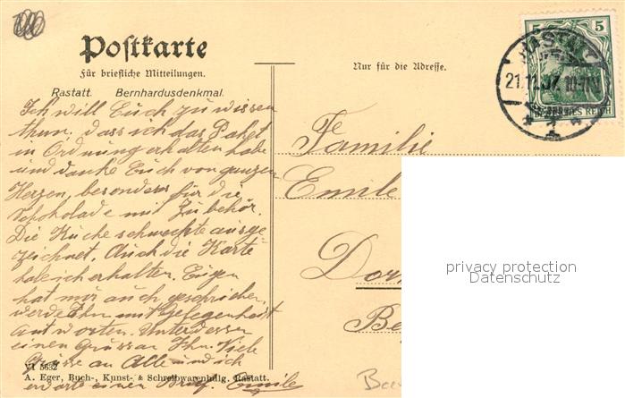 43496874 alte Postkarte Rastatt Bernhardus Denkmal postalisch gelaufen Erhaltung siehe scans [KathaD81] KatCode: 11110008216043