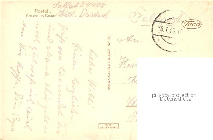73360095 alte Postkarte Rastatt Schloss im Rauhreif postalisch gelaufen Feldpost – Stempel Erhaltung siehe scans [LiesaD40] KatCode: 11110008216043