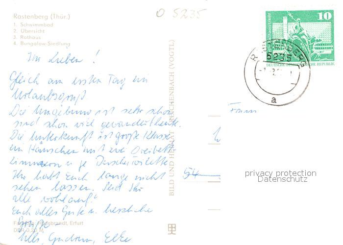 72935766 alte Postkarte Rastenberg Schwimmbad uebersicht Rathaus Bungalow Siedlung postalisch gelaufen Erhaltung siehe scans [FriedD77] KatCode: 11110016068042