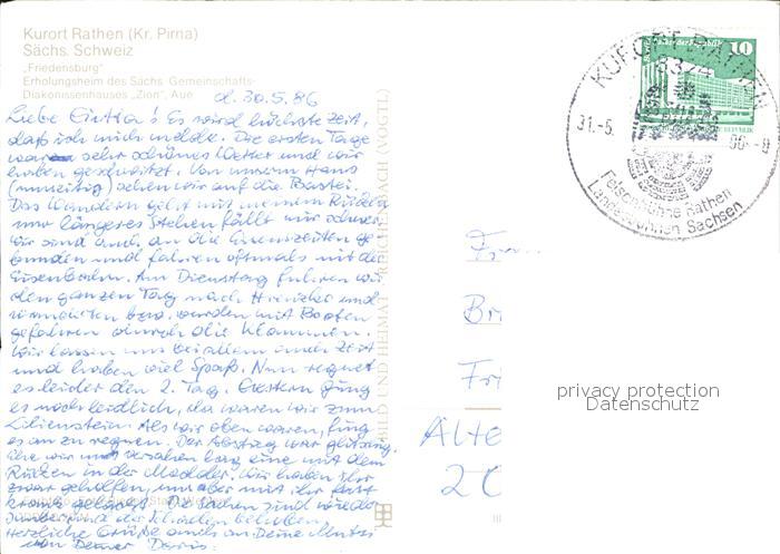 72478922 alte Postkarte Rathen Saechsische Schweiz Friedensburg Erholungsheim Diakonissenhaus Zion Aue postalisch gelaufen Erhaltung siehe scans KatCode: 11110014287310
