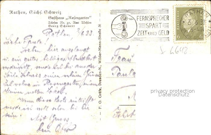41815819 alte Postkarte Rathen Saechsische Schweiz Gasthaus Rosengarten postalisch gelaufen Erhaltung siehe scans KatCode: 11110014287310