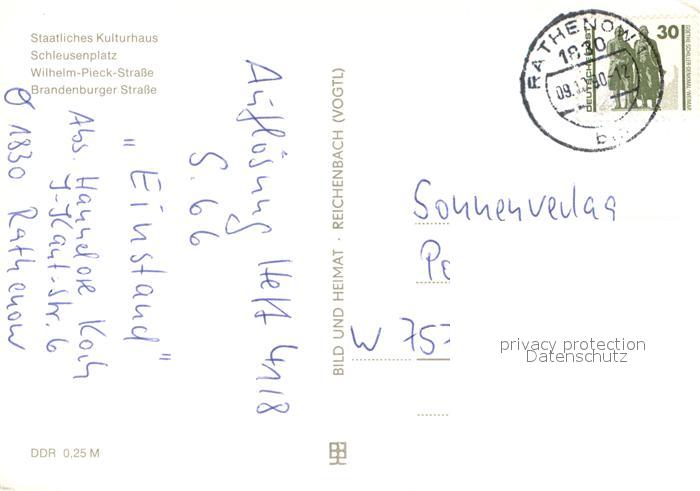 73669101 alte Postkarte Rathenow Staatliches Kurhaus Schleusenplatz Wilhelm Pieck Strasse Brandenburger Strasse postalisch gelaufen Erhaltung siehe scans [WerneD78] KatCode: 11110012063252