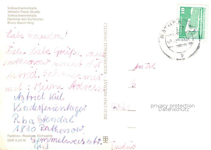 73304571 alte Postkarte Rathenow Volksschwimmhalle Wilhelm Pieck Strasse Denkmal des Kurfuersten Bruno Baum Ring Wappen postalisch gelaufen Erhaltung siehe scans [FriedD77] KatCode: 11110012063252