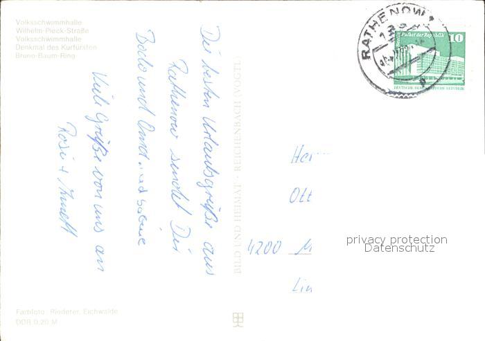 72025209 alte Postkarte Rathenow Wilhelm- Pieck- Strasse Volksschwimmhalle Denkmal des Kurfuersten postalisch gelaufen KatCode: 11110012063252