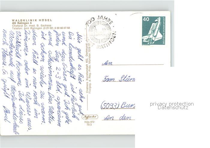 71975354 alte Postkarte Ratingen Waldklinik Hoesel Fliegeraufnahme postalisch gelaufen Erhaltung siehe scans KatCode: 11110005158028