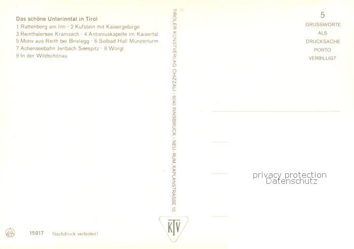 73303678 Rattenberg Inn Kufstein Kaisergebirge Reinthalersee Kramsach Kapelle Reith Bad Hall Muenzerturm Achenseebahn Jenbach Seespitz Woergl Wildschoenau Urlaubsparadies Unterinntal postalisch nicht gelaufen Erhaltung siehe scans [FriedD77] KatCode: 11110009183113