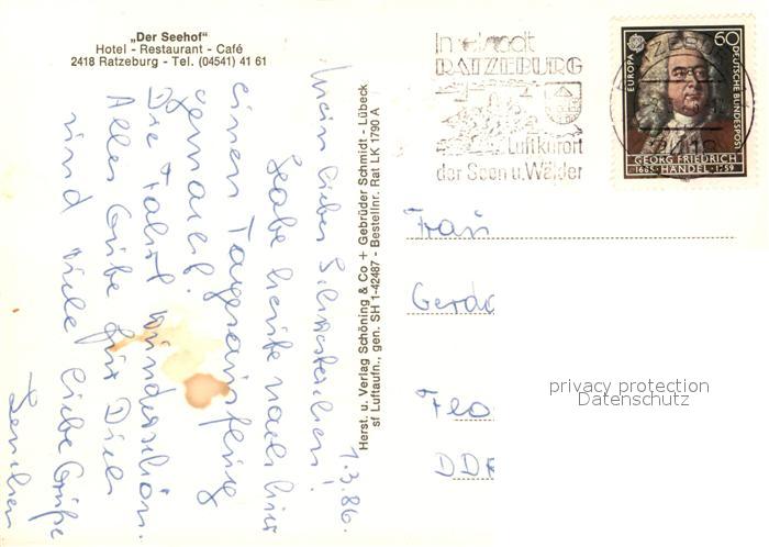 73087348 alte Postkarte Ratzeburg Hotel-Restaurant Seehof postalisch gelaufen Erhaltung siehe scans [PaolaD17] KatCode: 11110001053100