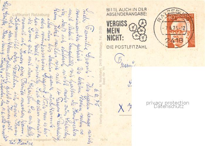 73170509 alte Postkarte Ratzeburg Luftkurort Naturpark Lauenburgische Seen Fliegeraufnahme postalisch gelaufen Erhaltung siehe scans [FriedD77] KatCode: 11110001053100