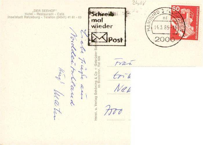 73949553 Ratzeburg Schleswig-Holstein Hotel Der Seehof Fliegeraufnahme Brunnen Gastraeume Terrasse postalisch gelaufen Erhaltung siehe scans [WerneD78] alte Postkarte Wern Katcode 11110001053100
