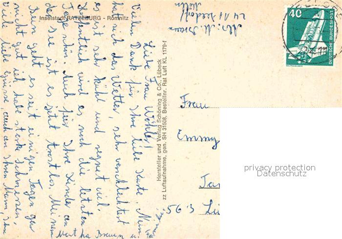 72725751 alte Postkarte Ratzeburg Schleswig-Holstein Roemnitz Fliegeraufnahme postalisch gelaufen Erhaltung siehe scans [WerneD78] KatCode: 11110001053100