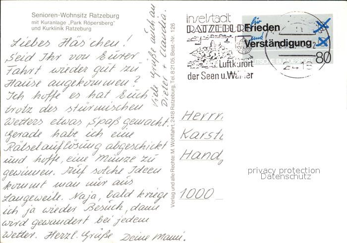 72580425 alte Postkarte Ratzeburg Schleswig-Holstein Senioren Wohnsitz Kuranlage Park Roepersberg Kurklinik postalisch gelaufen Erhaltung siehe scans [KathaD79] KatCode: 11110001053100