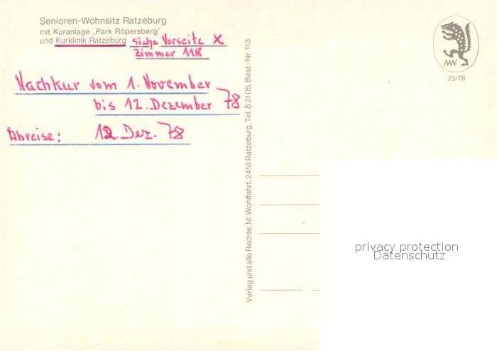 73616341 Ratzeburg Senioren Wohnsitz Ratzeburg mit Kuranlage Park Roepersberg und Kurklinik Ratzeburg postalisch nicht gelaufen Erhaltung siehe scans [WerneD78] KatCode: 11110001053100