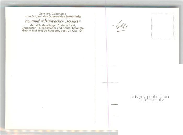 42937882 Raubach Odenwald Odenwalder Jakob Ihrig genannt Raubacher Joggel postalisch nicht gelaufen Erhaltung siehe scans [KathaD81] KatCode: 11110006437014