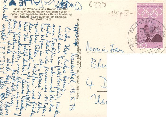73872339 alte Postkarte Rauenthal Panorama Gasthaus Zur Krone Bubenhaeuser Hoehe postalisch gelaufen Erhaltung siehe scans [WerneD78] KatCode: 11110006439003