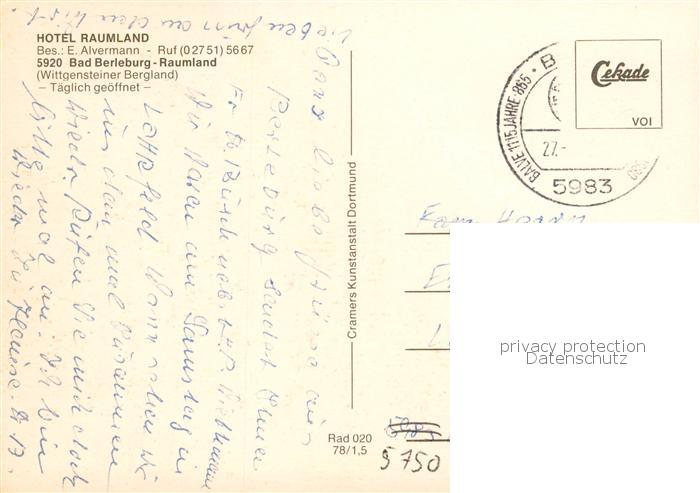 73874022 Raumland Bad Berleburg Hotel Raumland postalisch nicht gelaufen Erhaltung siehe scans [WerneD78] KatCode: 11110005970004