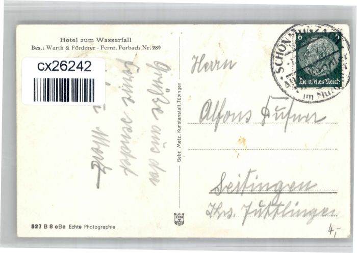 30838324 alte Postkarte Raumuenzach otel Wasserfall postalisch gelaufen KatCode: 11110008216013