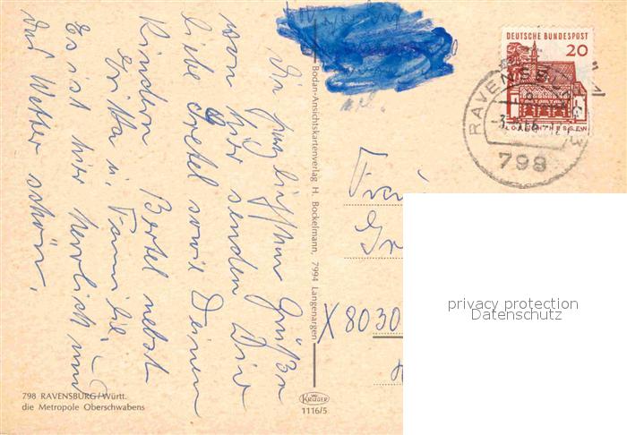 72706948 alte Postkarte Ravensburg Wuerttemberg Blaserturm Mehlsack Obertor Gesamtansicht postalisch gelaufen Erhaltung siehe scans [AndreD76] KatCode: 11110008436064