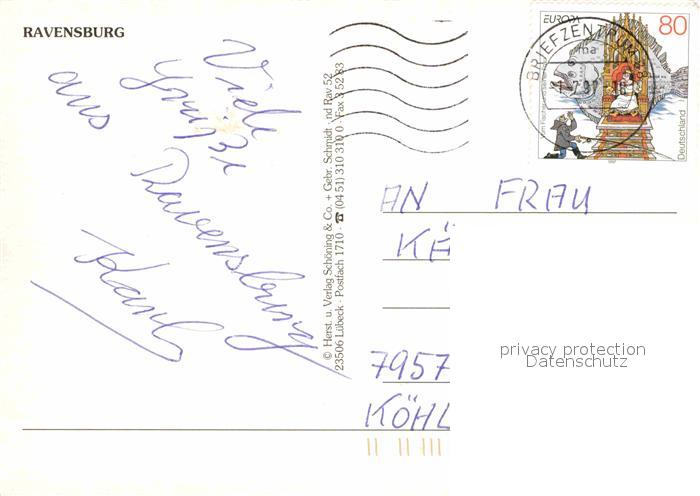 72858444 alte Postkarte Ravensburg Wuerttemberg Brunnen Kirche Stadtblick Strassenpartien Turm postalisch gelaufen Erhaltung siehe scans [WerneD78] KatCode: 11110008436064