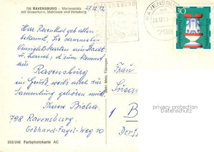 73124715 alte Postkarte Ravensburg Wuerttemberg Marienplatz Blaserturm Mehlsack und Veitsburg postalisch gelaufen Erhaltung siehe scans [FriedD77] KatCode: 11110008436064