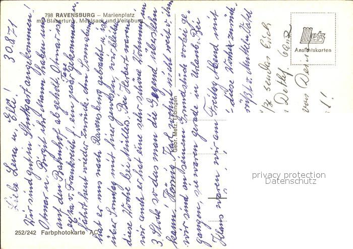 alte Postkarte Ravensburg Wuerttemberg Marienplatz mit Blaserturm Mehlsack Veitsburg postalisch gelaufen Erhaltung siehe scans