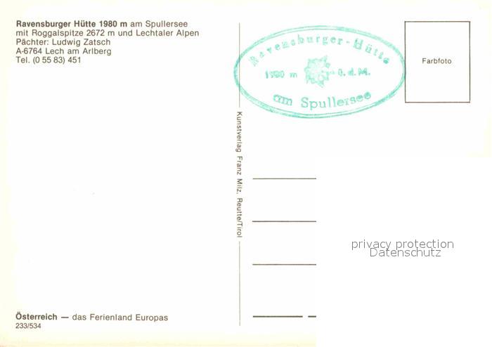 72686266 Ravensburgerhuette am Spullersee mit Roggalspitze Lech am Arlberg postalisch nicht gelaufen Erhaltung siehe scans [LiesaD40] KatCode: 11390