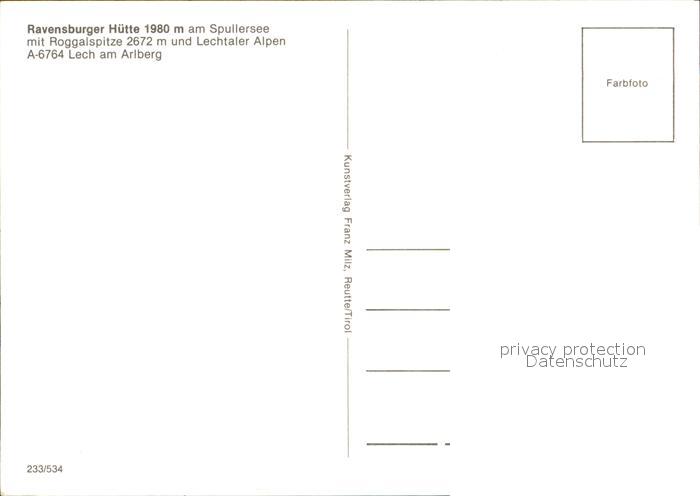 72549224 Ravensburgerhuette am Spullersee mit Roggalspitze postalisch nicht gelaufen Erhaltung siehe scans [LiesaD40 kv021box] KatCode: 11390