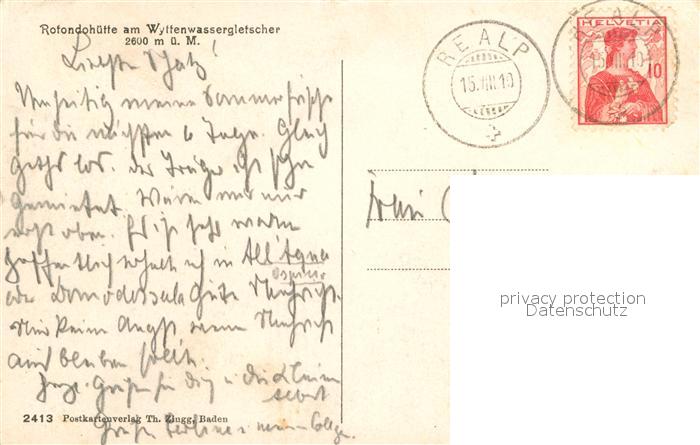 12963539 alte Postkarte Realp Rotondohuette am Wyffenwassegletscher postalisch gelaufen Erhaltung siehe scans [WerneD78] KatCode: 11470220685204