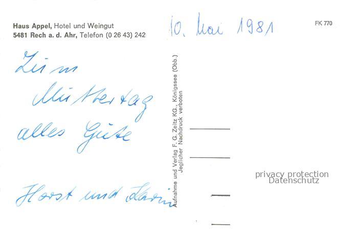 74050013 Rech Ahr Panorama Haus Appel Hotel und Weingut postalisch nicht gelaufen Erhaltung siehe scans [WerneD78] KatCode: 11110007131068