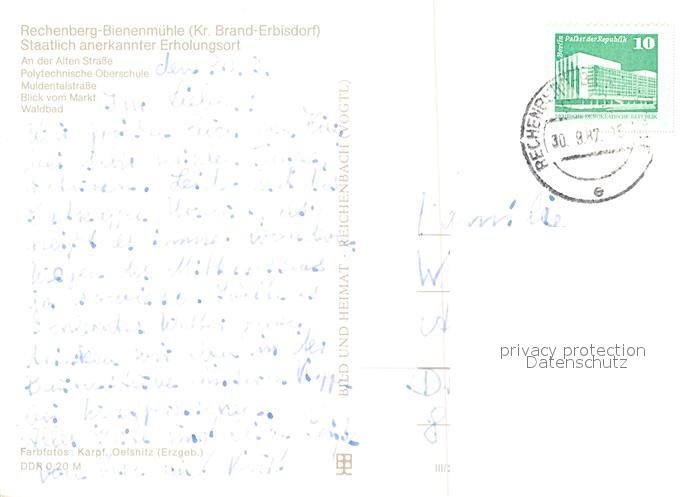 73029127 alte Postkarte Rechenberg-Bienenmuehle Osterzgebirge Alte Strasse Polytechnische Oberschule Muldentalstrasse Markt Waldbad postalisch gelaufen Erhaltung siehe scans [KathaD81] KatCode: 11110014177350