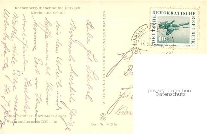 73067799 alte Postkarte Rechenberg-Bienenmuehle Osterzgebirge Kirche Schule postalisch gelaufen Erhaltung siehe scans [NatalD47] KatCode: 11110014177350