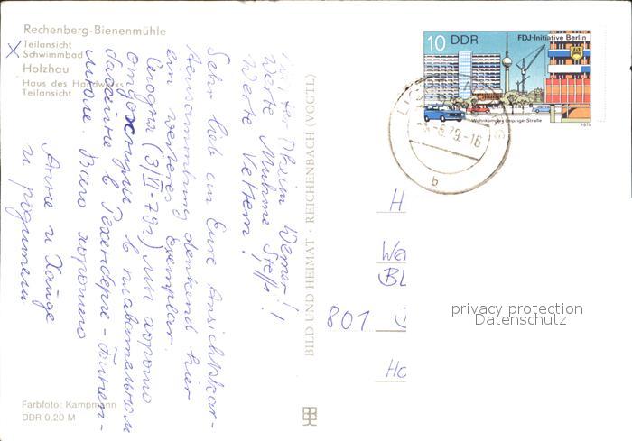 72354906 alte Postkarte Rechenberg-Bienenmuehle Osterzgebirge Teilansicht Schwimmbad Holzhau Haus des Handwerks postalisch gelaufen Erhaltung siehe scans KatCode: 11110014177350