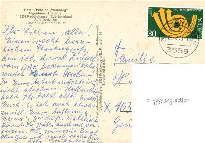 73658692 alte Postkarte Reddighausen Hotel Pension Weinberg Restaurant Fremdenzimmer Ederbergland postalisch gelaufen Erhaltung siehe scans [FriedD77] KatCode: 11110006635014