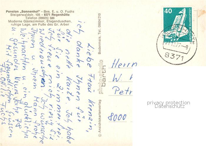 73865047 alte Postkarte Regenhuette Bayerisch Eisenstein Pension Sonnenhof Gastraum Ortsansicht postalisch gelaufen Erhaltung siehe scans [FriedD77] KatCode: 11110009276115