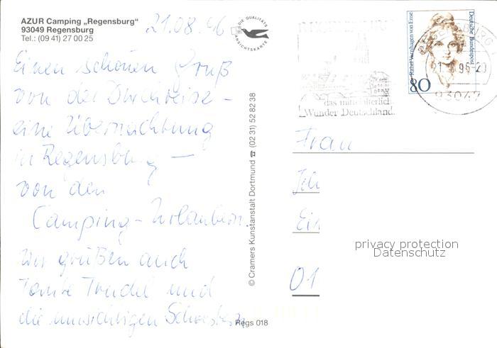72370681 alte Postkarte REGENSBURG Bayern Camping Azur Fahrgastschiff Dom Walhalla postalisch gelaufen Erhaltung siehe scans KatCode: 11110009362000